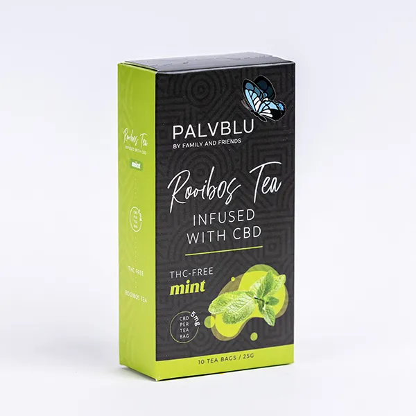 Palvblu’s Rooibos CBD Infused Tea with Mint (10 pack) presents a refreshing and calming blend that combines the natural goodness of Rooibos tea, the wellness benefits of CBD, and the invigorating essence of mint. Each pack contains 10 thoughtfully crafted tea bags, providing a convenient and enjoyable way to experience the soothing effects of CBD alongside the cool and uplifting notes of mint. This infusion is designed to promote relaxation, ease stress, and deliver a delightful sensory experience. Embrace a moment of tranquility with Palvblu’s Rooibos CBD Infused Tea with Mint in a pack of 10 for your convenience.